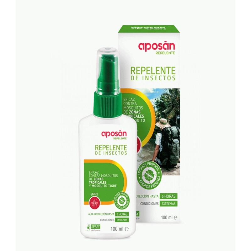 Aposan Repelente Insectos Forte 100 ml es una solución eficaz en formato spray diseñada para evitar las molestas picaduras de mosquitos, incluso en condiciones extremas y climas tropicales. Con una eficacia probada, este repelente ofrece una alta protección de hasta 6 horas después de su aplicación. Ideal para adultos y niños mayores de 3 años, proporciona una barrera efectiva contra el mosquito tigre y otros mosquitos en zonas tropicales.